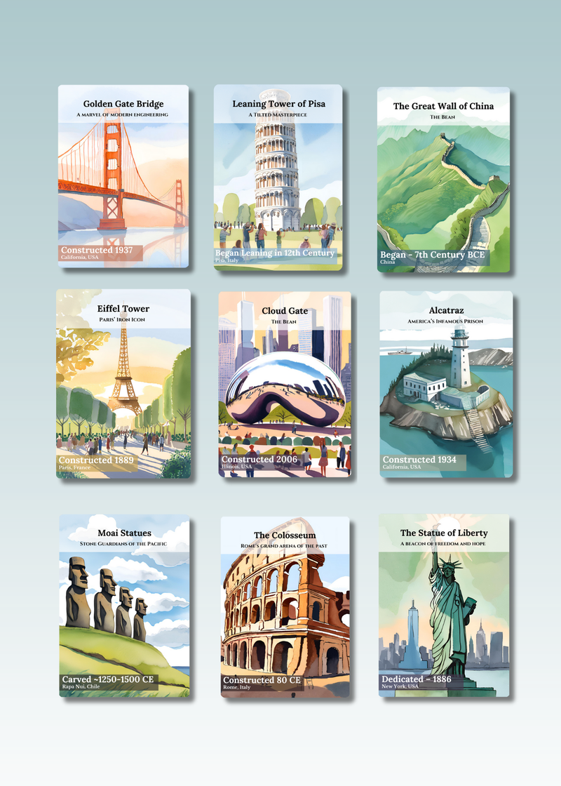 Uncover the world’s most iconic wonders. Each card showcases remarkable landmarks and the stories that make them unforgettable.